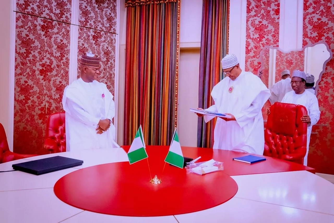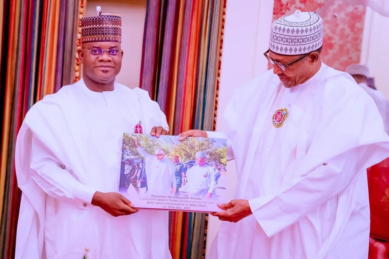The Kogi State Governor, Alh. Yahaya Bello visited President Muhammadu Buhari, GCFR, Friday, to thank Mr President for honoring the state with his esteemed presence to commission some of the legacy projects executed by the Governor of the State, Alh. Yahaya Bello. The presence of the President was highly appreciated by the people of the state, a message the Governor took to Mr President. Governor Yahaya Bello also used the opportunity of the visit to present a Photo Album on the memorable event to Mr President. The President who admired the Photo Album, thanked the Governor for being a good host. www.kogistate.gov.ng can authoritatively report that Mr President commended the Governor for his laudable projects in the State and urged him not to repent in creating history for himself. It would be recalled that while in the state, the President commissioned the Reference Hospital, Okene, The Ultra Modern Ohinoyi Palace, Road Projects, the first ever Flyover in the state, GYB Model Science Secondary School and the Mohammadu Buhari Square. Courtesy: Kogi State Ministry of Information and Communications